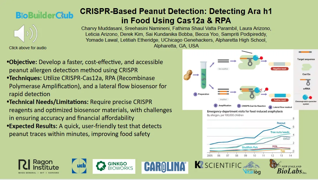 We are developing a faster and more accessible detection method using the DETECTR system, which integrates CRISPR-based technology for highly specific DNA recognition. Our approach employs recombinase polymerase amplification (RPA), an isothermal amplification technique, to rapidly increase the DNA concentration of a major peanut allergen, Ara h1, in food samples. The CRISPR-Cas12a enzyme will then identify the target dsDNA sequence. Upon binding, Cas12a activates collateral cleavage of an ssDNA reporter linked to the chromoprotein amilCP, generating a visible color change. This reaction will be incorporated into a lateral flow biosensor to create an easily interpretable test. Our project aims to develop a faster, cost-effective method for detecting peanuts in food to help individuals with peanut allergies make safer choices. By improving detection speed and accuracy, we hope to reduce the risk of accidental exposure and severe allergic reactions.